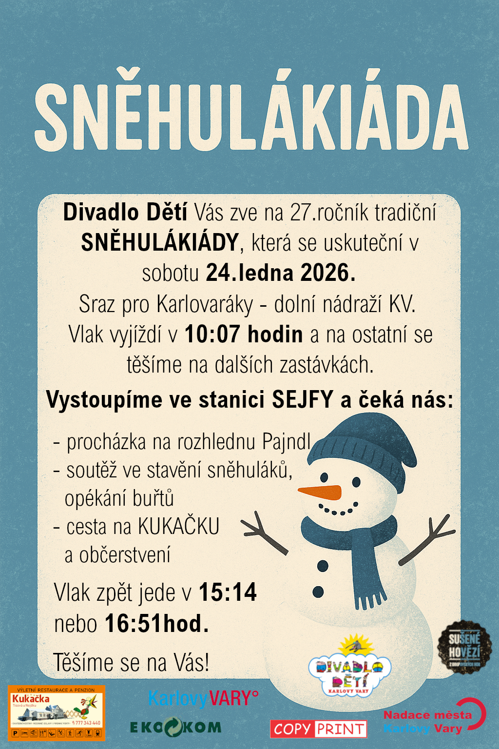 Kdo ví, možná to byl právě plakát, navržený krásnou karlovarskou výtvarnicí Zuzanou Hájkovou, kdo vytáhl děti a jejich rodiče od pc a televizí a v sobotním dopoledni je přivedl k zastávkám vlaku, jedoucího romantickou zasněženou krajinou z Karlových Varů do Krušných hor. Letošní paní Zima je ke Sněhulákiádě 2022 milostivá a do již nachystané nadílky sněhu začala od brzkých ranních hodin přisypávat sníh. První skupinky dětí se nalodily do vlaku štěstí již na Dolním nádraží v Karlových Varech.
